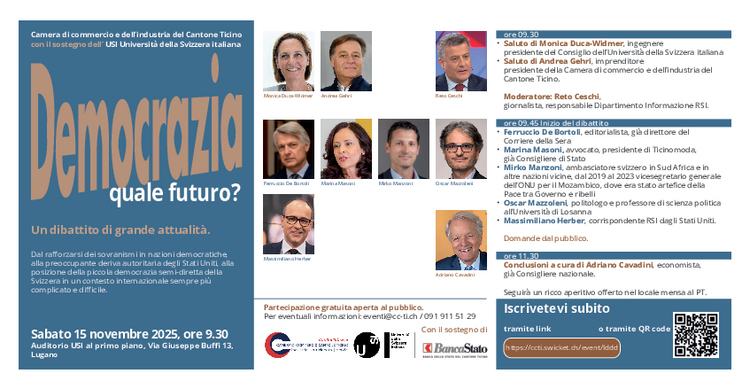 Un dibattito pubblico “Democrazia: quale futuro?” con ospiti di rilievo del mondo politico, accademico ed economico per riflettere sulle sfide della democrazia in un contesto internazionale complesso.